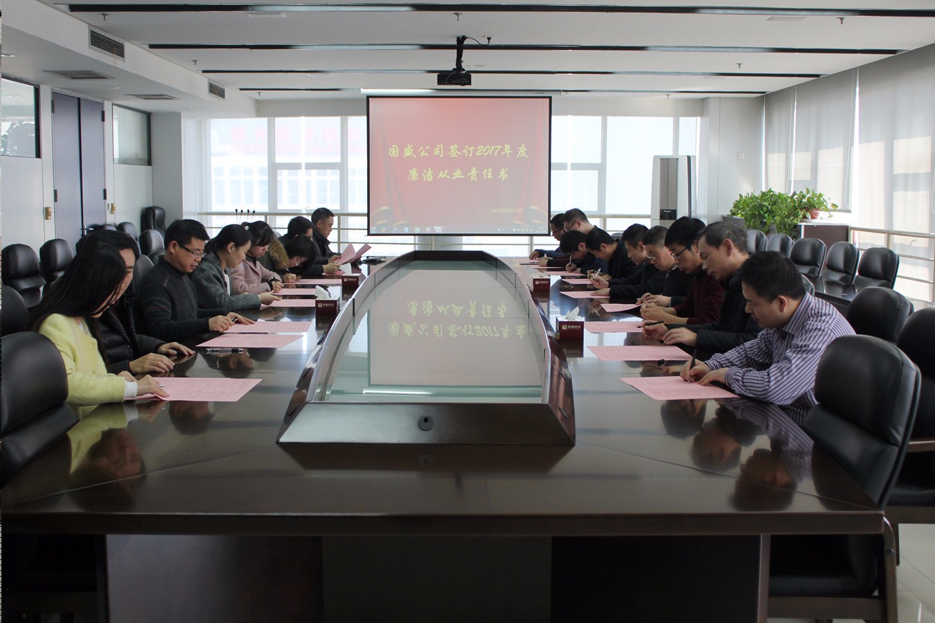 為進(jìn)一步強(qiáng)化反腐倡廉建設(shè),引導(dǎo)公司干部職工正確對(duì)待和行使手中的權(quán)利,不斷提高廉潔自律意識(shí),國(guó)盛公司結(jié)合實(shí)際情況,制定廉潔從業(yè)責(zé)任書(shū)。公司董事長(zhǎng)趙麗、總經(jīng)理李中亞、副總經(jīng)理宋超等高管,中層管理人員及重點(diǎn)崗位人員于2月15日簽訂了責(zé)任書(shū)。
