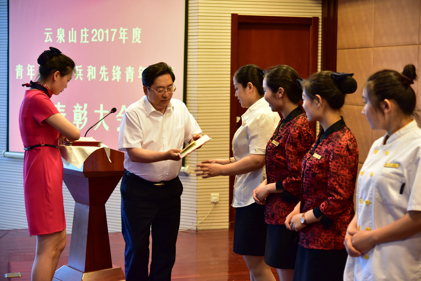 5月27日下午,云泉山莊召開2017年度青年服務(wù)標兵和先鋒青年團隊表彰大會,楊國華副總經(jīng)理宣讀表彰決定,李中亞總經(jīng)理為獲獎員工頒發(fā)證書。